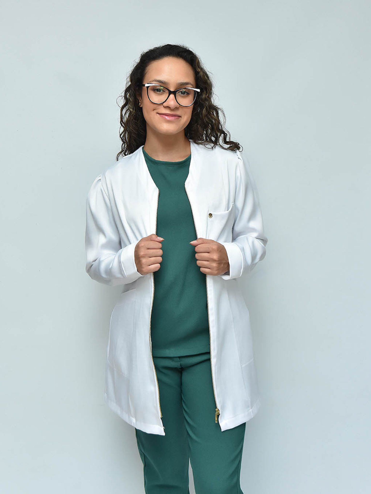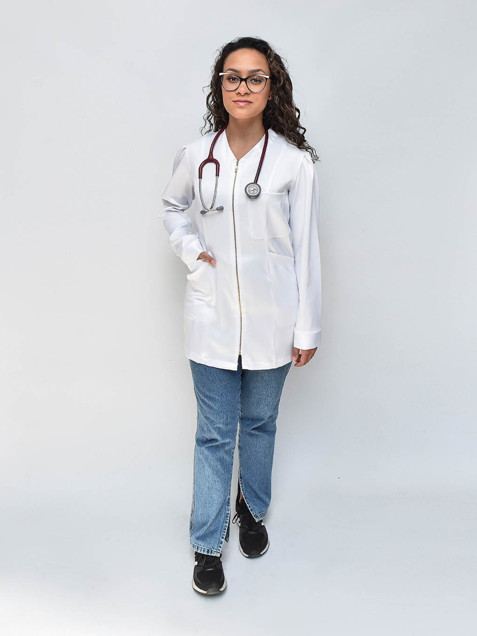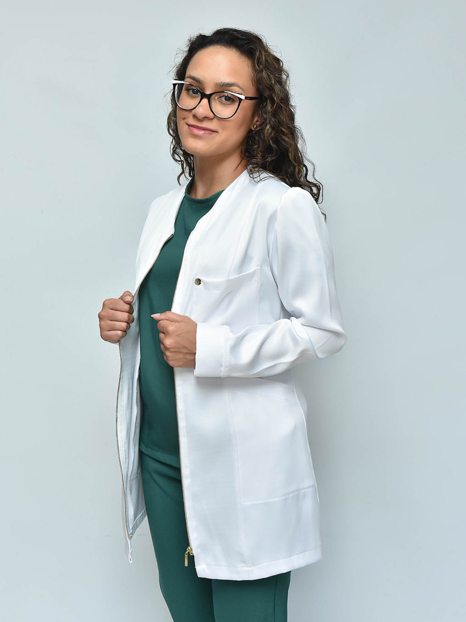 Jaleco feminino com manga Princesa, decote em V, zíper de metal, cintura com detalhes e 2 bolsos inferiores.