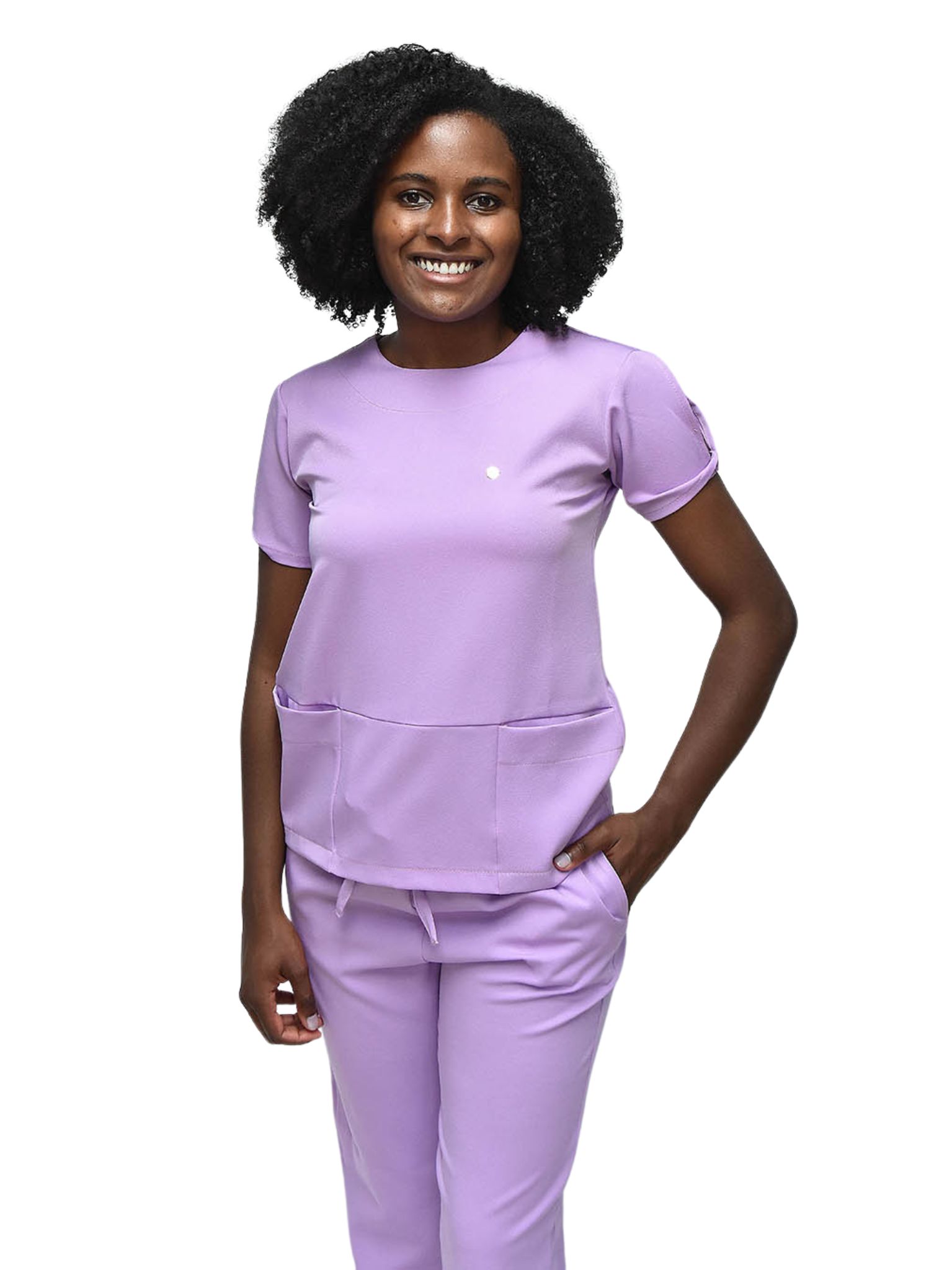 Um Scrub delicado e versátil com detalhe na manga, 2 bolsos na blusa, 2 bolsos laterais e 2 bolsos traseiros.