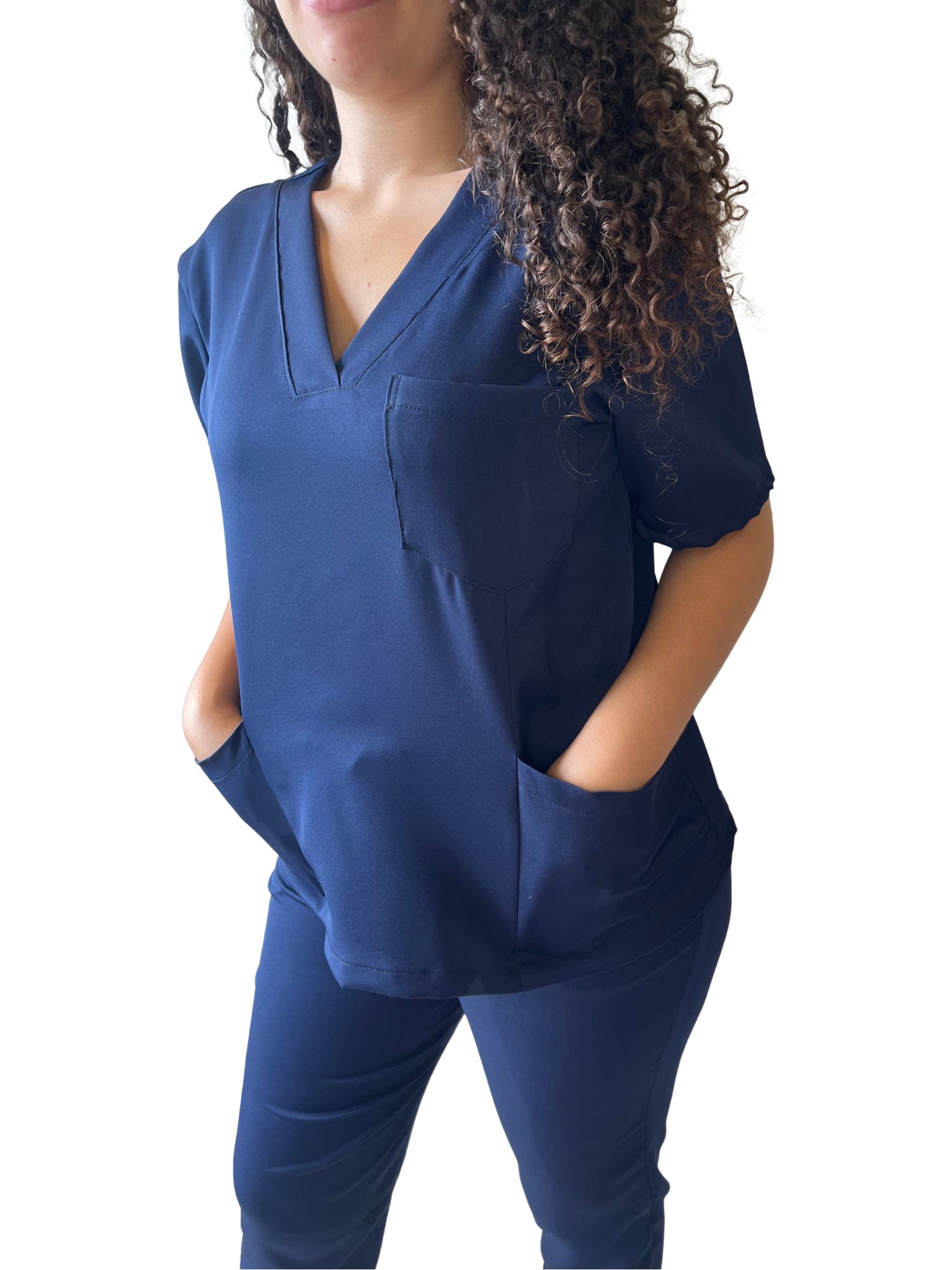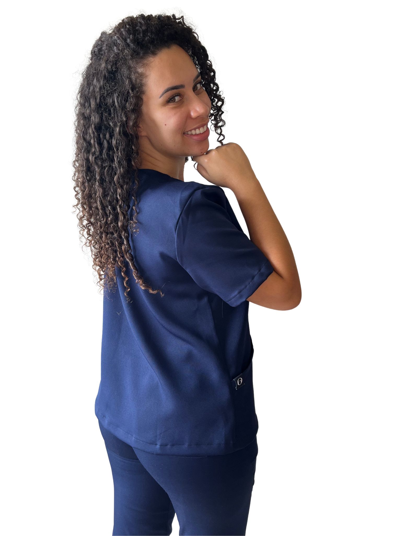 O Scrub Tradicional reúne conforto, praticidade e elegância numa única peça. Confeccionado em tecido de alfaiataria (95% poliéster e 5% elastano), garante flexibilidade durante os movimentos, não amarrota com facilidade e apresenta toque macio ao corpo.